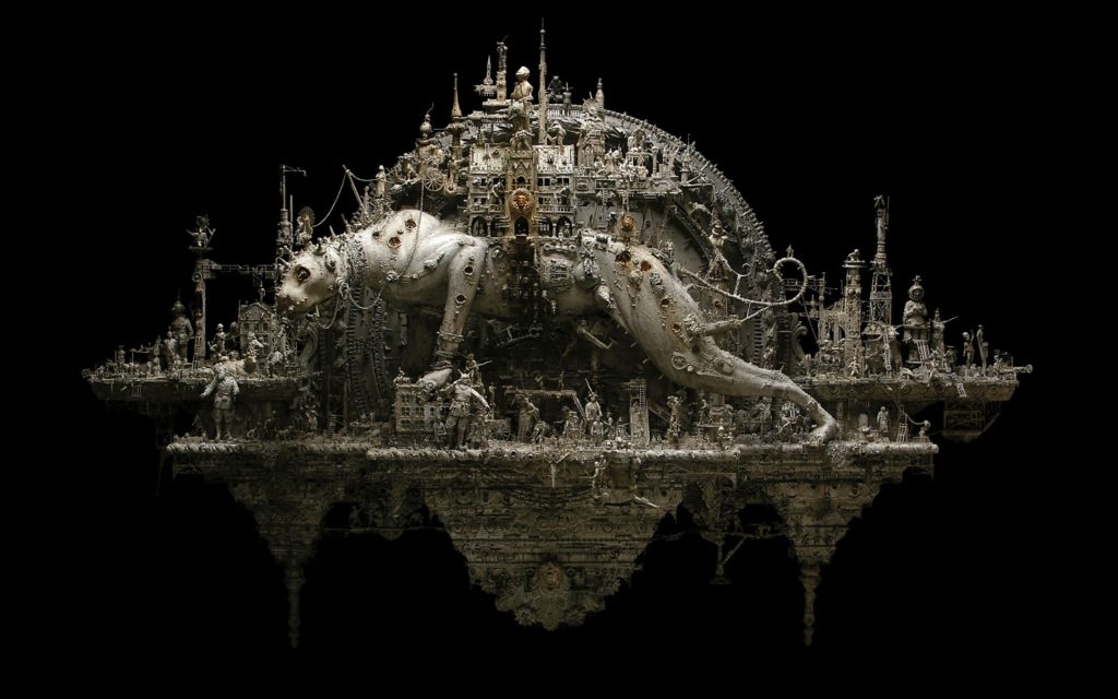 Vamos falar um pouco da história do artista Kris Kuksi e como ele chegou a suas esculturas surreais e macabras. Kris Kursi nascido em 02 de março de 1973, em Springfield Missouri, passou sua juventude em reclusão rural e isolamento, dois irmãos significativamente mais velhos, um pai ausente e seu padrasto alcoólatra, abrindo um caminho para um indivíduo saturado em imaginação e introversão. Sua propensão para o incomum tem sido uma constante desde a infância, um fascínio ao longo da vida que se prestava à sua arte macabra mais tarde na vida. O grotesco para ele, como parecia, era linda.